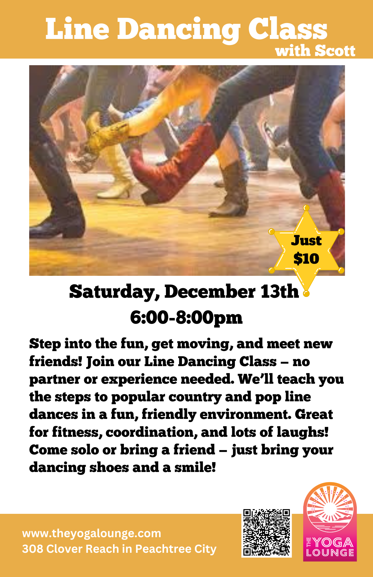 Line Dancing Class Saturday, December 13, 2025 6:00 PM 8:00 PM Google Calendar ICS Book 12/13 line dancing class now